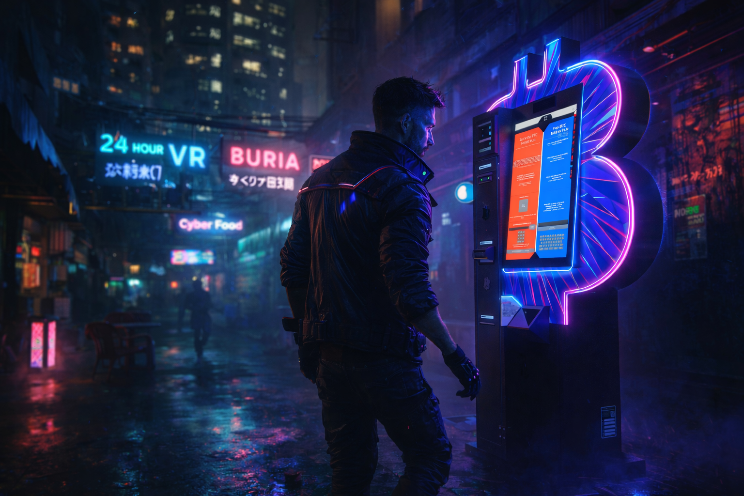 Nowoczesny bitcoin ATM w futurystycznym stylu cyberpunk symbolizujący szybki dostęp do kryptowalut w Szwajcarii. Sieć Rothbard Bitcoin ATMs umożliwia wygodne korzystanie z crypto ATM w miastach takich jak Zürich, Genève, Basel, Bern, Lausanne i Luzern.